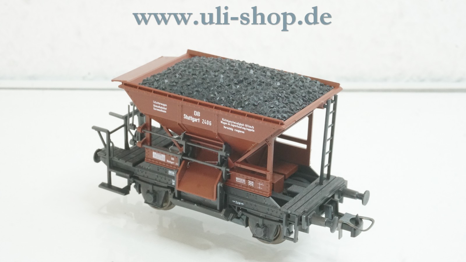 Roco H0 Güterwagen mit der Artikelnummer 4334A Talbot Schotterwagen Stuttgart 2406 der DB beladen mit Kohle. Der Artikel ist für den Betrieb mit Gleichstrom vorgesehen. Die Originalverpackung ist vorhanden.