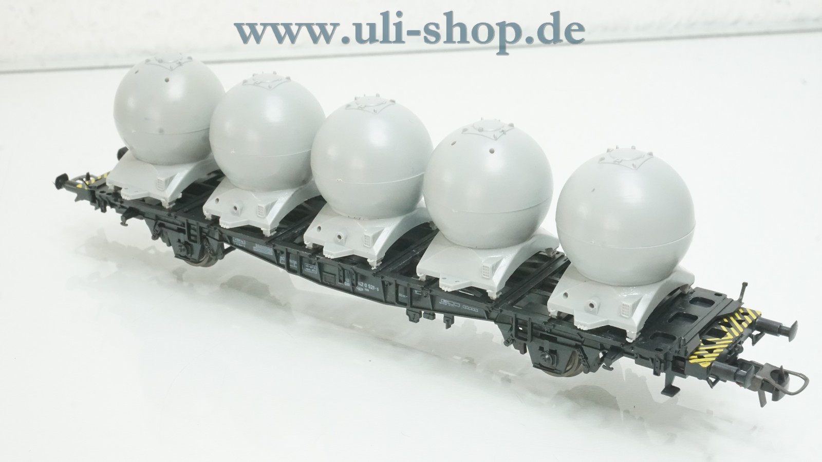 Roco H0 Güterwagen mit der Artikelnummer 4338 Kugeldruck-Behältertragwagen. Der Artikel ist für den Betrieb mit Gleichstrom vorgesehen. Die Originalverpackung ist vorhanden.