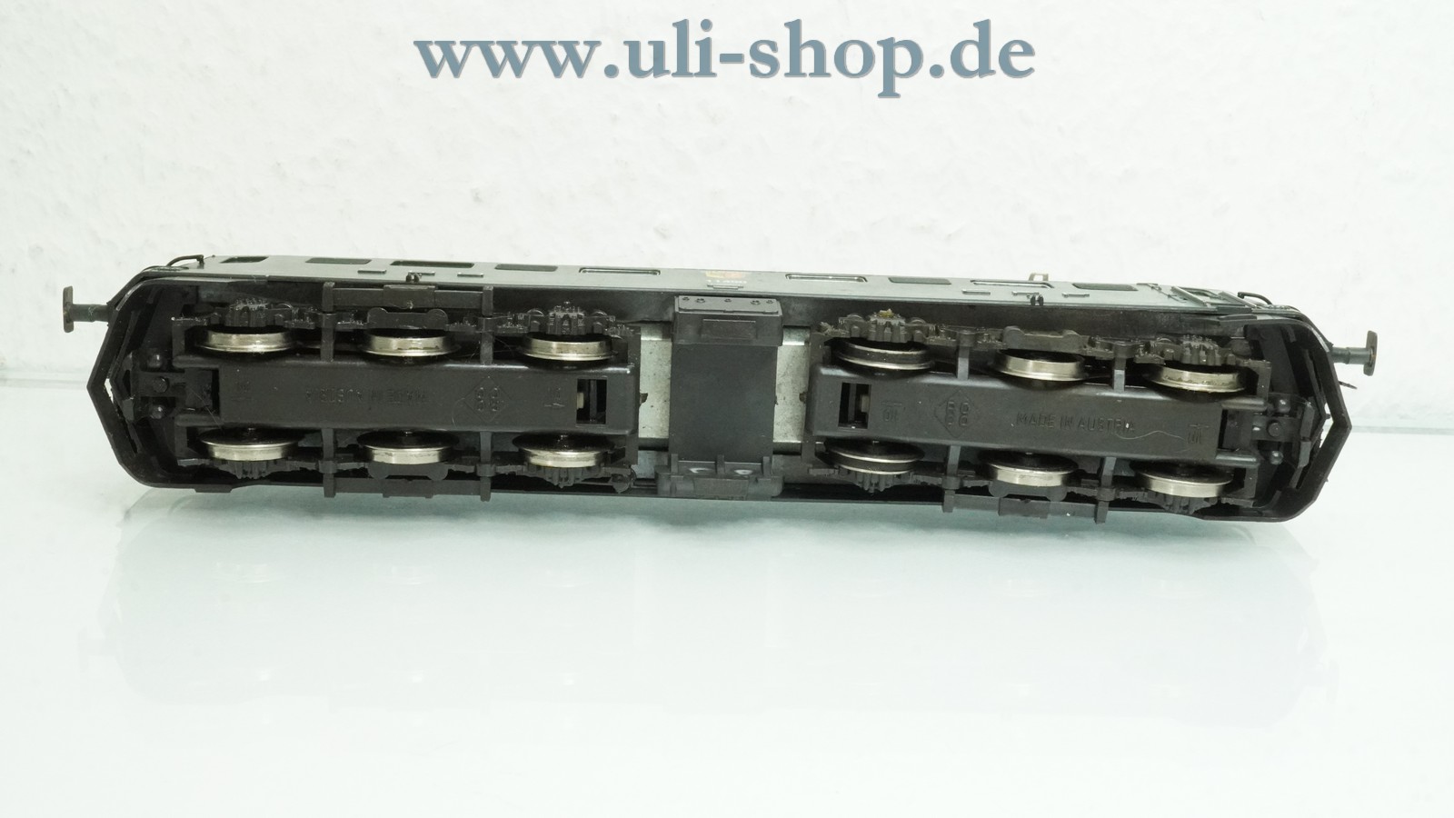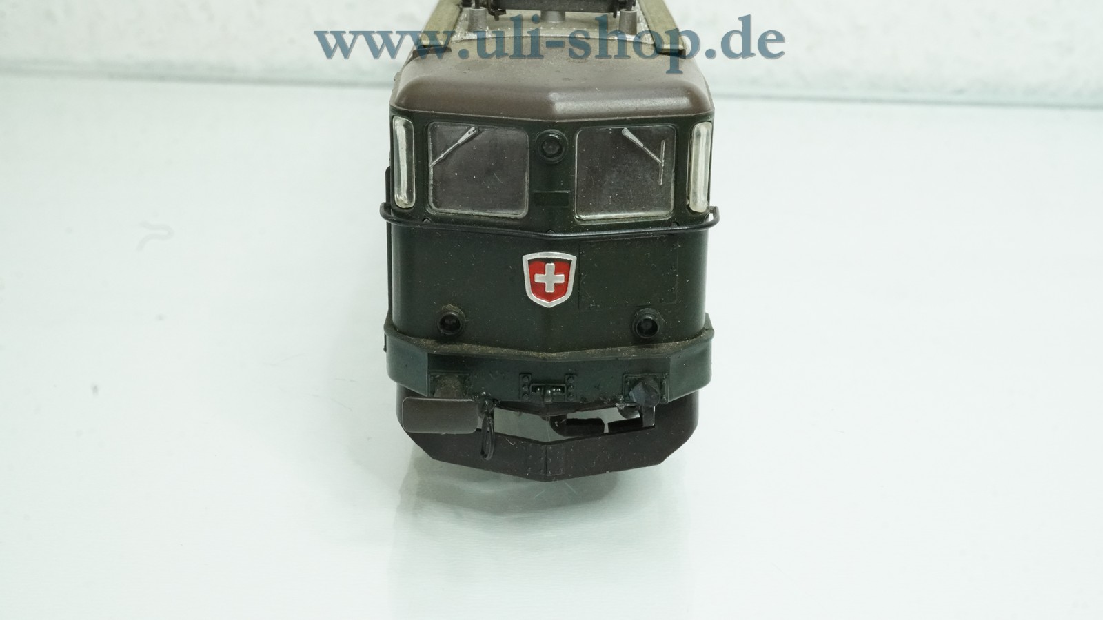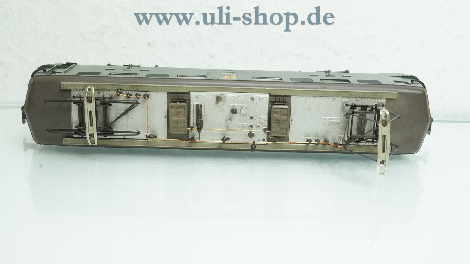 Den optischen Zustand würde ich als bespielt/gebraucht mit normalen Gebrauchsspuren (durch Spielbetrieb) bezeichnen. Auf dem Dach sind einige Isolatoren abgebrochen. Ob alle noch dabei sind wissen wir nicht. Zwei Puffer sind abgebrochen. Beide Kupplungen fehlen. Ein Dachstromabnehmer federt nicht richtig, er ist etwas verklemmt.