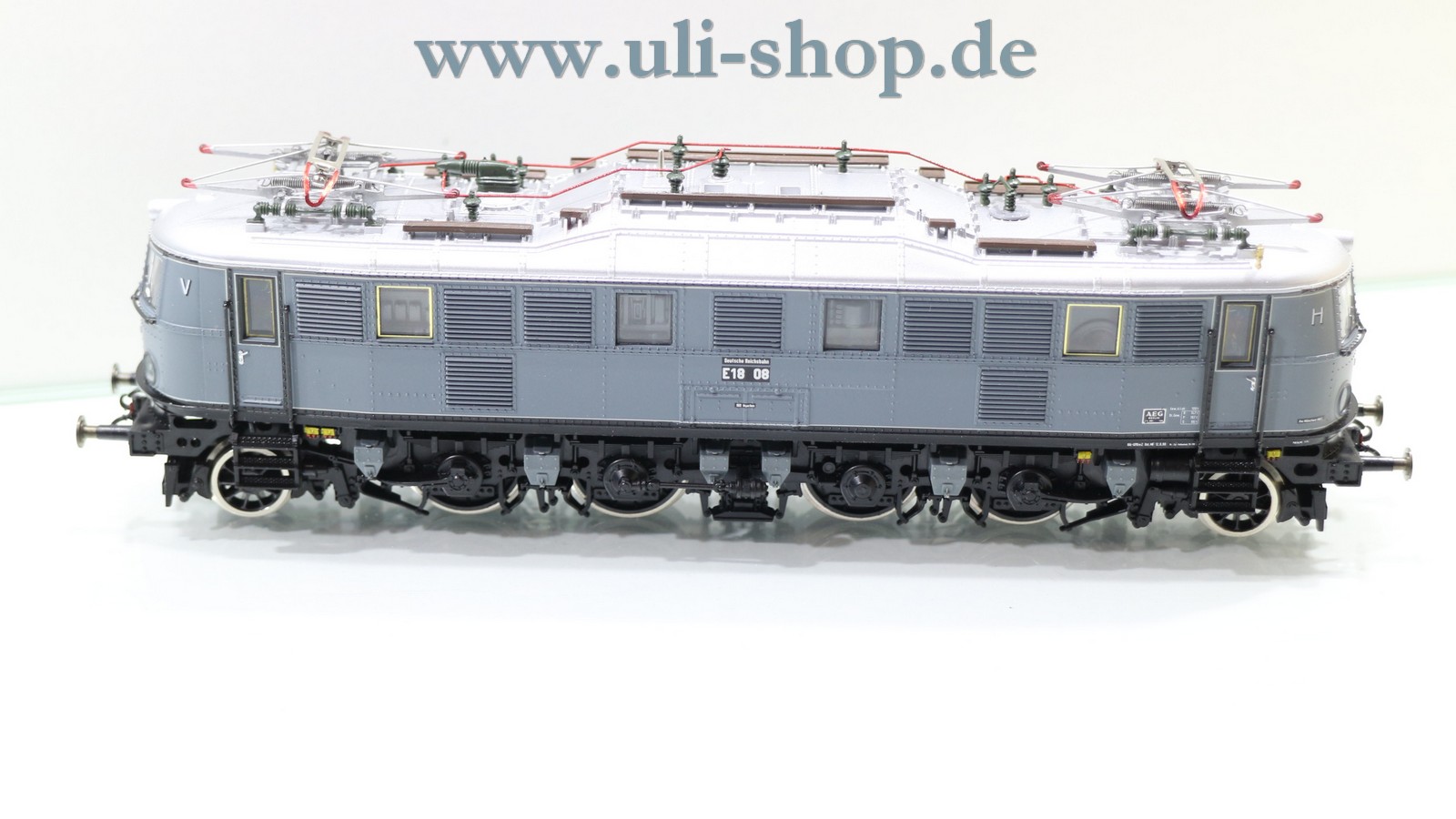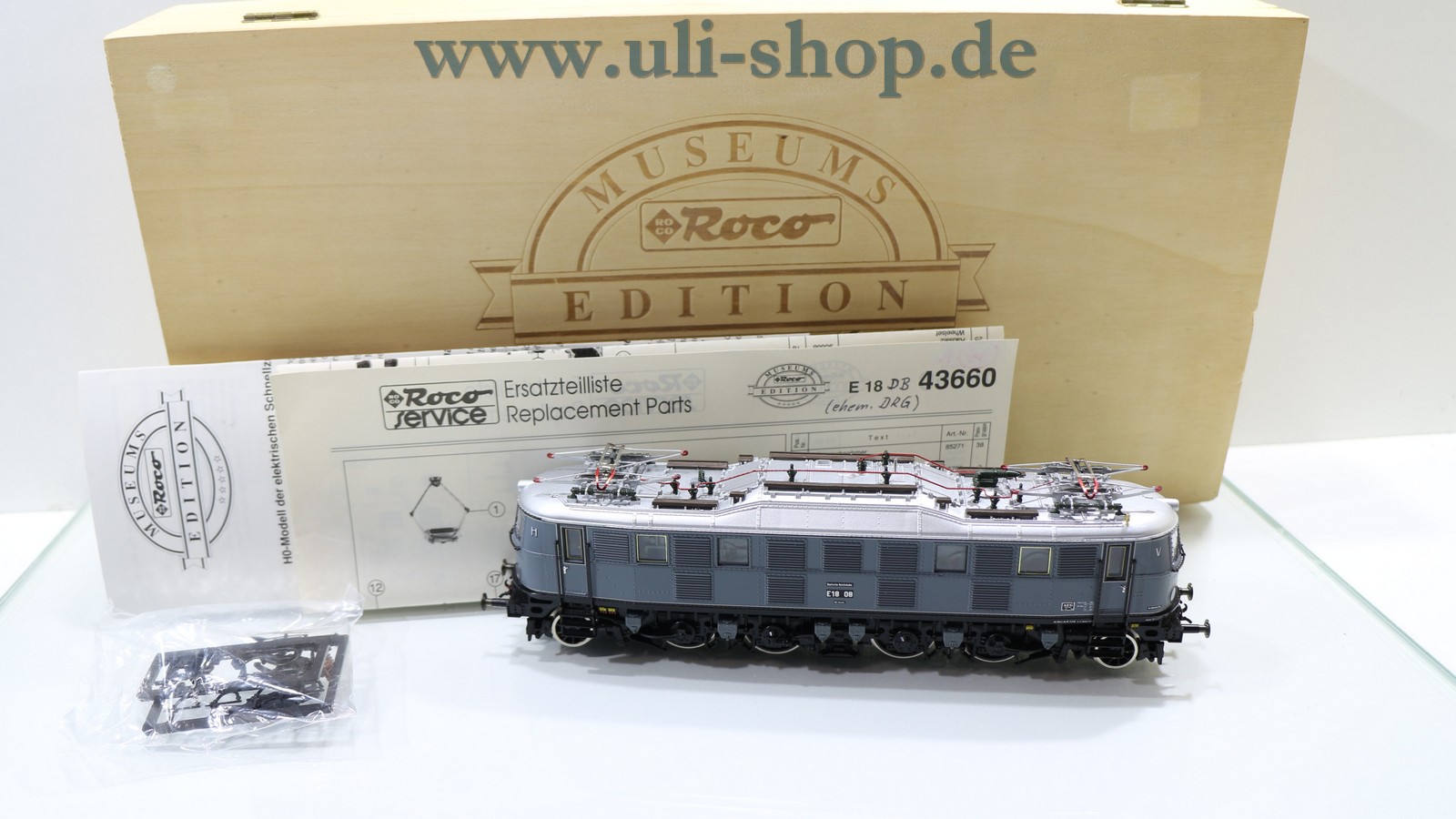 Roco H0 E-Lok mit der Artikelnummer 43660 Br. E18 08 der DRG. Der Artikel ist für den Betrieb mit Gleichstrom vorgesehen. Die Lok ist analog, sie kann daher nicht auf digital gesteuerten Anlagen fahren. Die Originalverpackung ist vorhanden. Es handelt sich um eine Museums Sonderedition.
