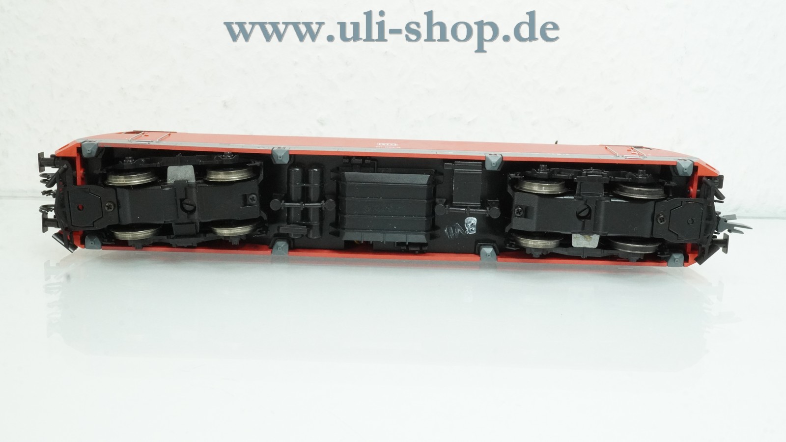 Den optischen Zustand würde ich als bespielt/gebraucht mit normalen Gebrauchsspuren (durch Spielbetrieb) bezeichnen. An einer Front fehlt der Aufnahmeschacht für die Kupplung. Bei einem Stromabnehmer fehlt die Arretrierung. Die beiden Kardankugeln waren gebrochen und wurden wieder geklebt. Eine Kupplung ist beschädigt. Ein Puffer ist abgebrochen.