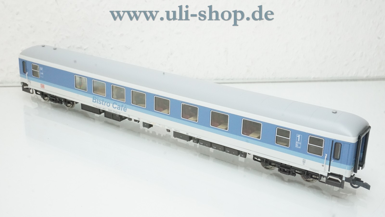Roco H0 Personenwagen mit der Artikelnummer 45052 InterRegio Schnellzugwagen 1. Klasse mit Bistro Cafe der DB-AG. Der Artikel ist für den Betrieb mit Gleichstrom vorgesehen. Die Originalverpackung ist vorhanden.