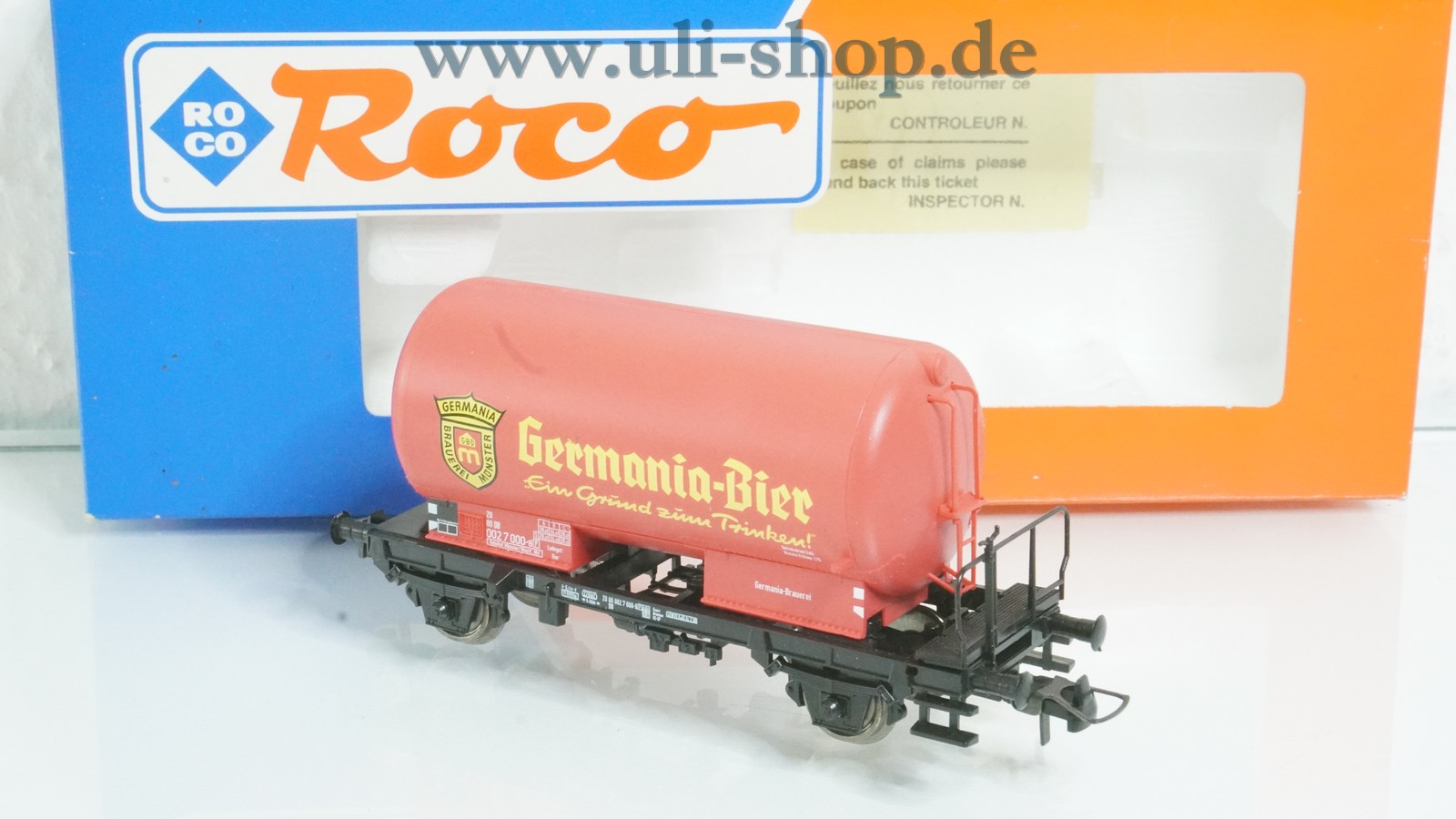 Roco H0 Güterwagen mit der Artikelnummer 47062 Kesselwagen Germania-Bier der DB. Der Artikel ist für den Betrieb mit Gleichstrom vorgesehen. Die Originalverpackung ist vorhanden.