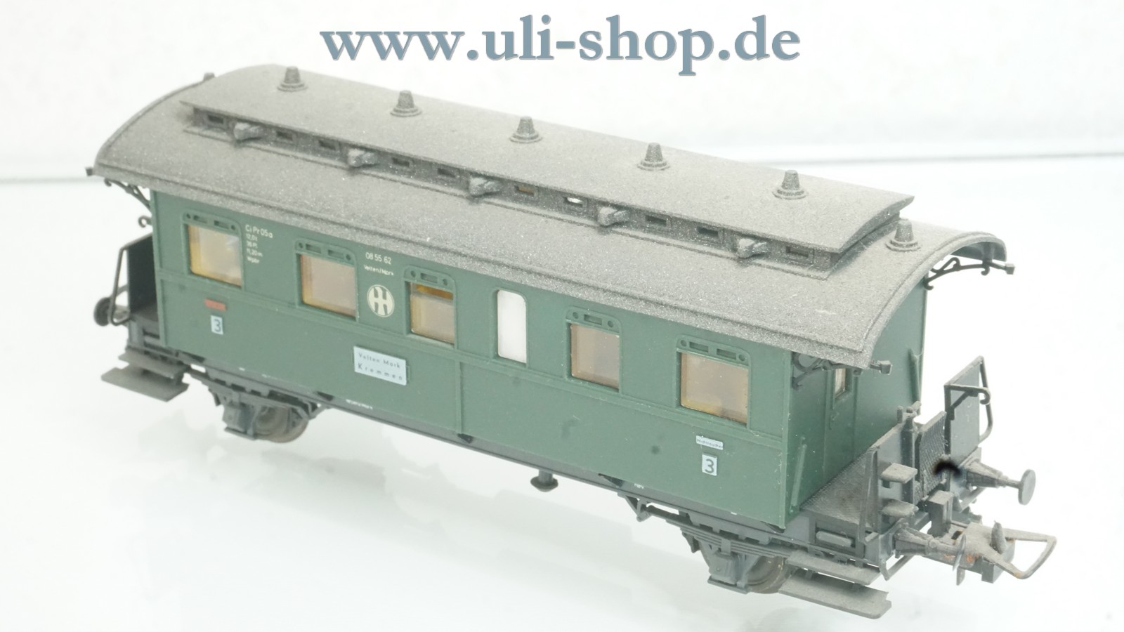 Röwa H0 Personenwagen mit der Artikelnummer 3076 Plattformwagen der DRG 3. Klasse. Der Artikel ist für den Betrieb mit Wechselstrom vorgesehen. Die Originalverpackung ist vorhanden. Bei der Verschmutzung, die etwa rechts unten auf den Bildern zu sehen ist, handelt es um eine Verschmutzung der Linse und nicht des Modells.