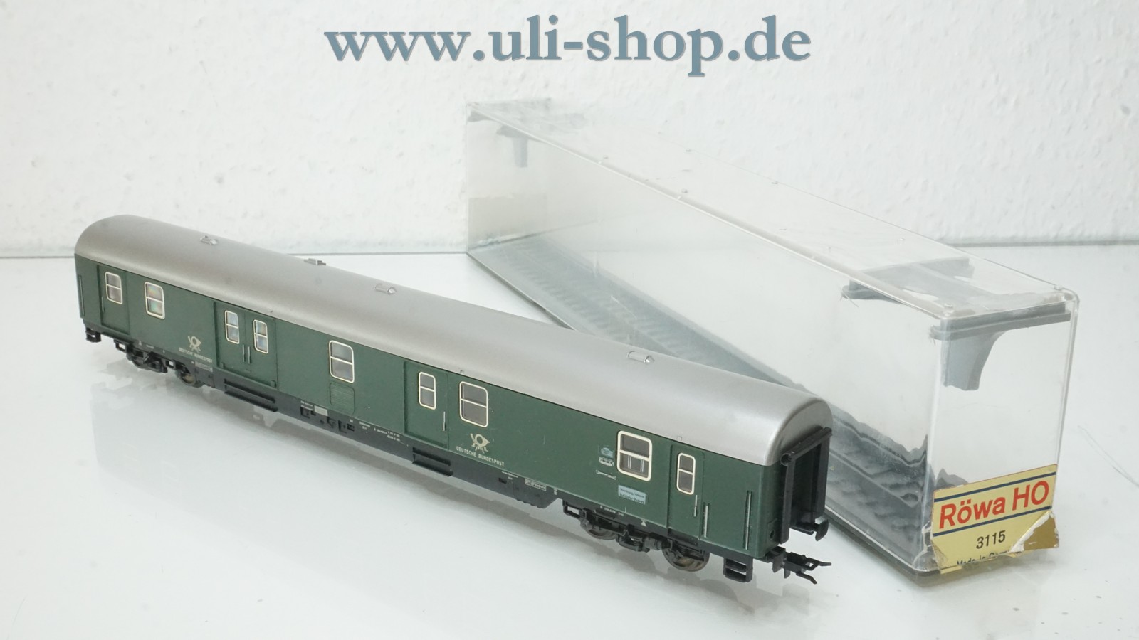 Röwa H0 Personenwagen mit der Artikelnummer 3115 Postwagen der Deutschen Bundespost Epoche IV. Der Artikel ist für den Betrieb mit Gleichstrom vorgesehen. Die Originalverpackung ist vorhanden.