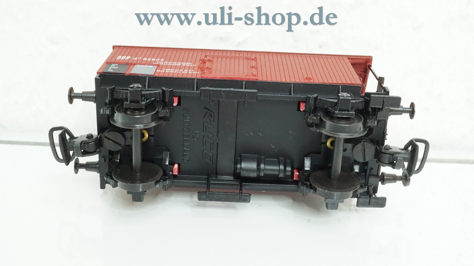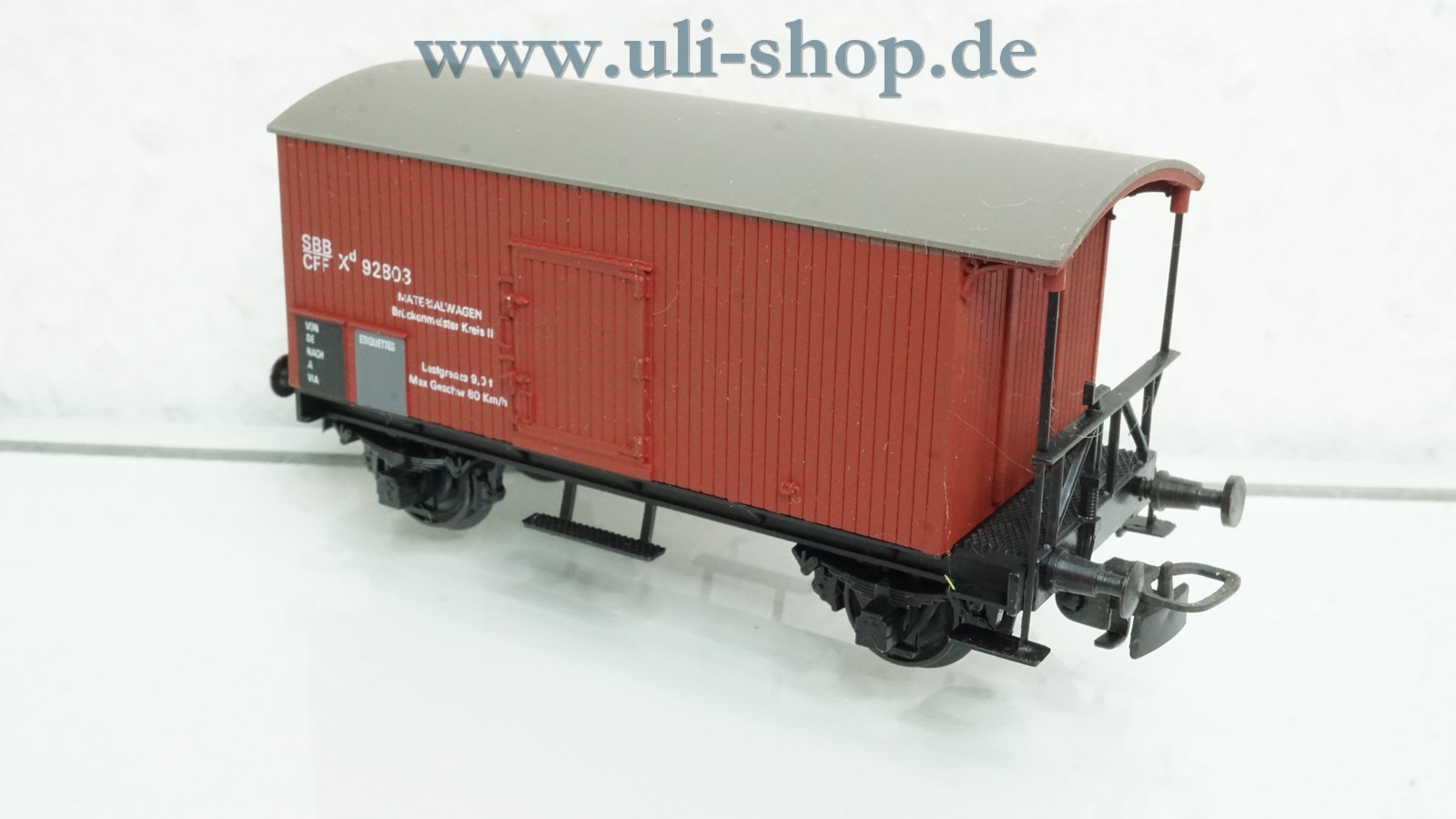 Ruco H0 Güterwagen mit der Artikelnummer 2001 gedeckt mit Bremserbühne "Materialwagen" der SBB. Der Artikel ist für den Betrieb mit Wechselstrom vorgesehen. Die Originalverpackung ist vorhanden.