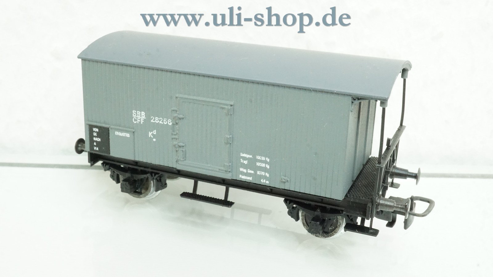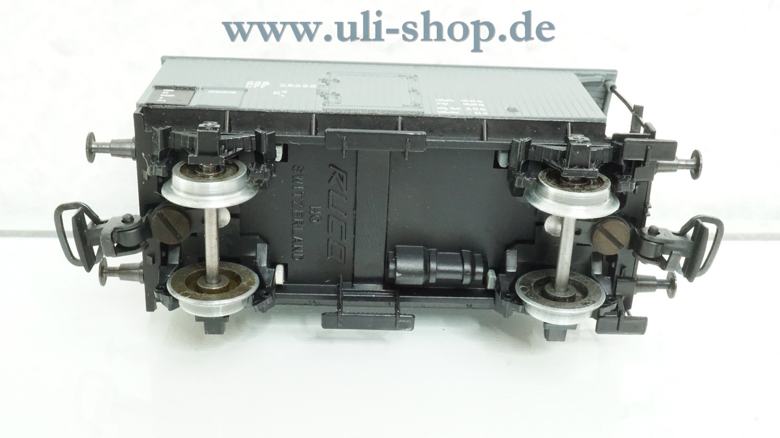 Ruco H0 Güterwagen mit der Artikelnummer 2005 gedeckt mit Bremserbühne grau der SBB. Der Artikel ist für den Betrieb mit Wechselstrom vorgesehen. Die Originalverpackung ist vorhanden.