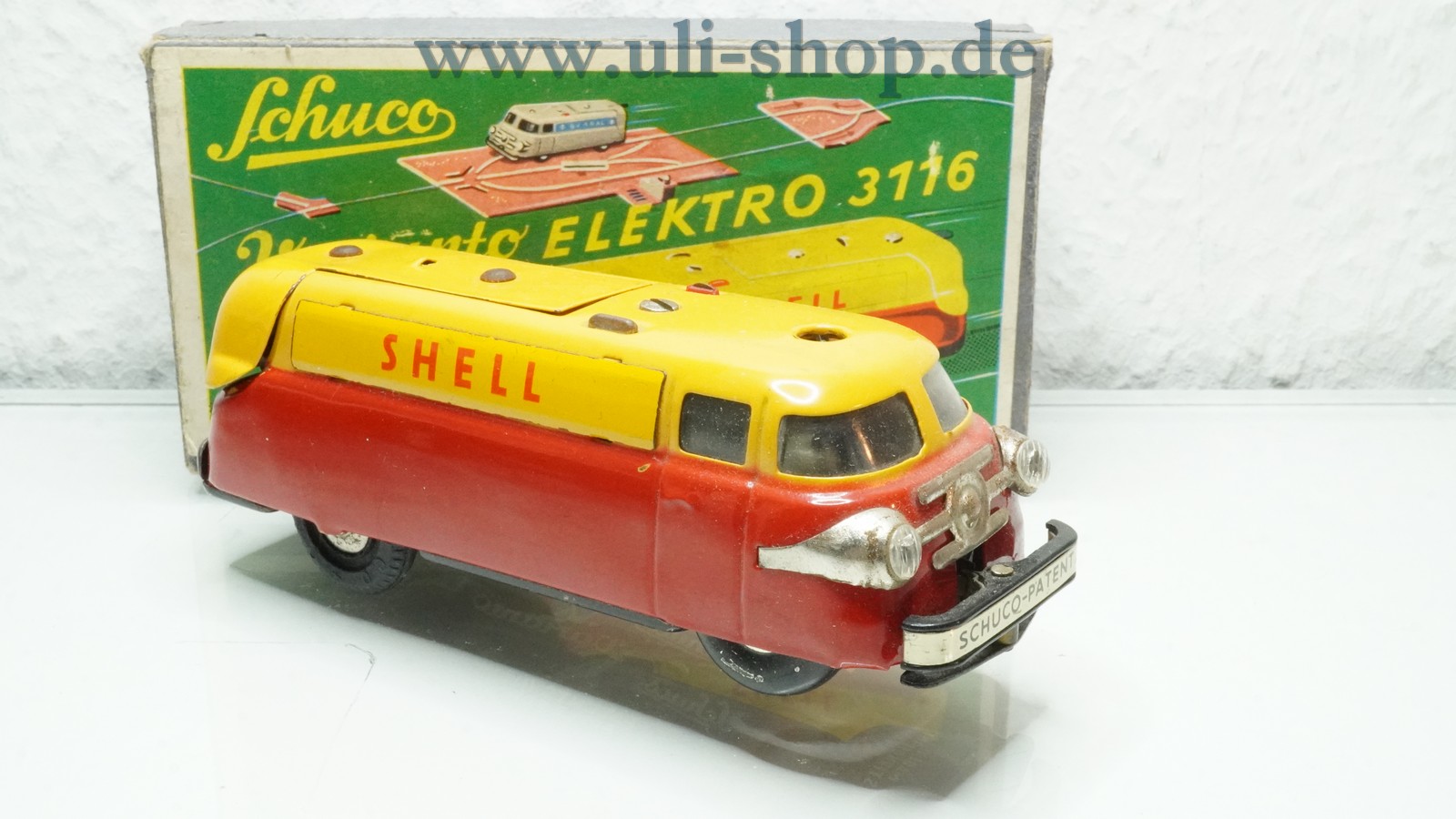Schuco mit der Artikelnummer 3116 Varianto Elektroauto LKW Shell. Die Originalverpackung ist vorhanden.