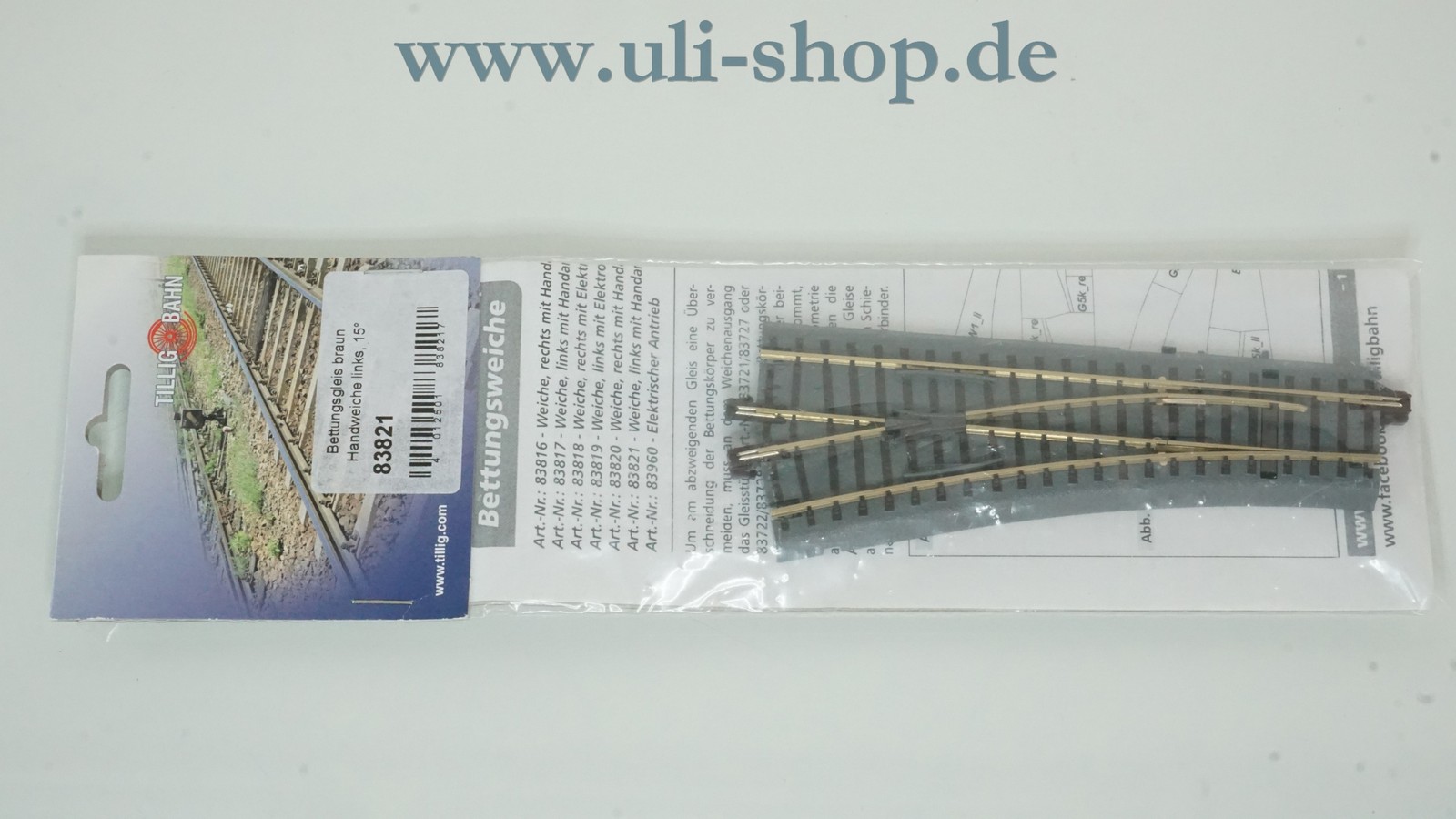 Tillig TT Gleismaterial mit der Artikelnummer 83821 Bettungsgleis braun Handweiche links. Der Artikel ist für den Betrieb mit Gleichstrom vorgesehen. Die Originalverpackung ist vorhanden.