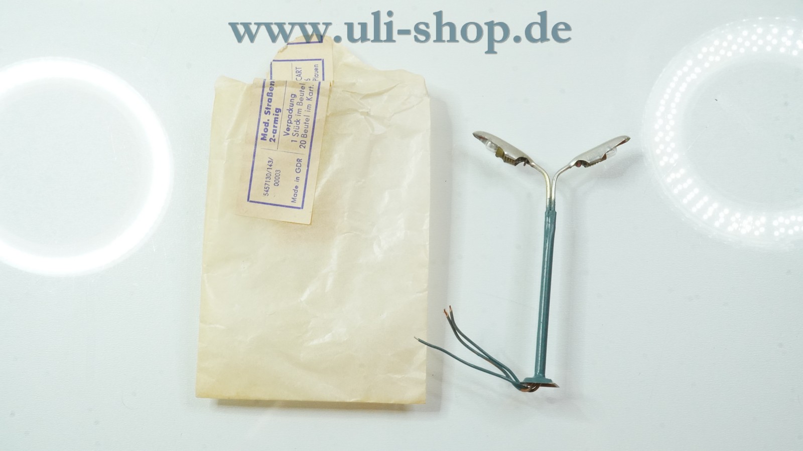 VEB Plasticart H0 Lampe mit der Artikelnummer 5457130/143/00003 Moderne Straßenleuchte 2-armig. Die Originalverpackung ist vorhanden.