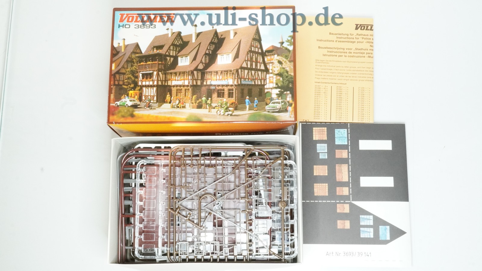 Vollmer H0 Modellhaus mit der Artikelnummer 3693 Rathaus mit Polizei und Gefängnis mit Inneneinrichtung und Beleuchtung Romantik Modell. Die Originalverpackung ist vorhanden. Die Verpackung des Bausatzes wurde schon einmal geöffnet. Wir können leider nicht mit Sicherheit behaupten, dass alle Teile vollständig vorhanden sind, es sieht aber danach aus. Sollte sich beim Zusammenbauen herausstellen, dass doch Teile fehlen, werden wir Ihnen den Kaufbetrag selbstverständlich zurückerstatten.