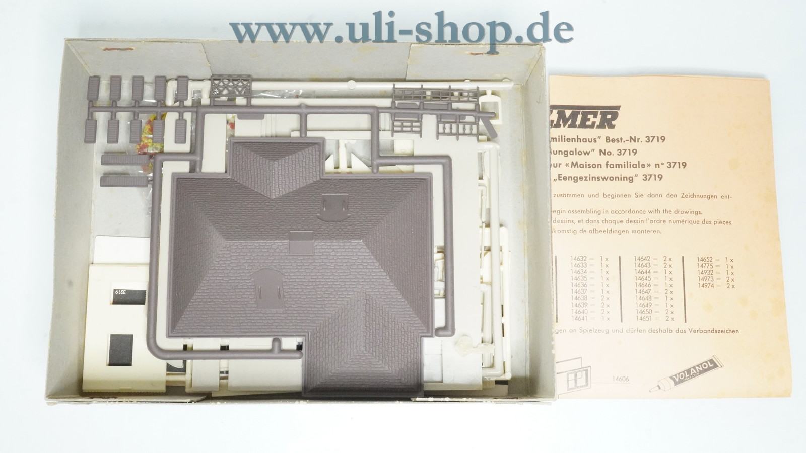 Vollmer H0 Modellhaus mit der Artikelnummer 3719 B Einfamilienhaus. Die Originalverpackung ist vorhanden. Die Verpackung des Bausatzes wurde schon einmal geöffnet. Wir können leider nicht mit Sicherheit behaupten, dass alle Teile vollständig vorhanden sind, es sieht aber danach aus. Sollte sich beim Zusammenbauen herausstellen, dass doch Teile fehlen, werden wir Ihnen den Kaufbetrag selbstverständlich zurückerstatten.